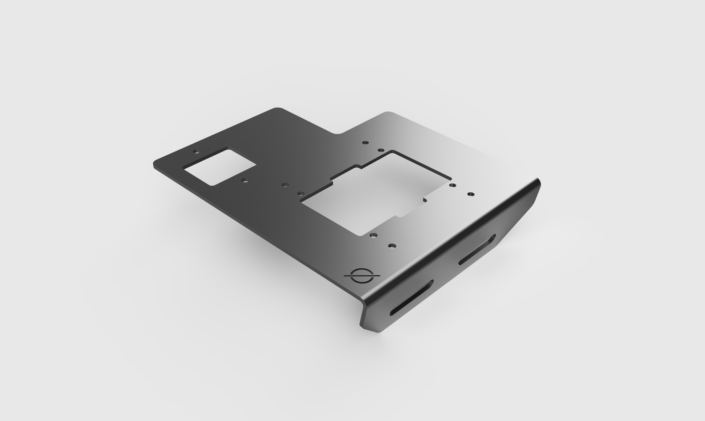 I designed this stainless steel panel to accomidate auxilary electrical wiring for my truck. It includes cutouts for a Bussmann RTMR 15303 fuse and relay box and a Blue Sea Systems 285-Series circuit breaker. The flange is bent at 95º to account for the slightly slanted under-hood mounting surface.