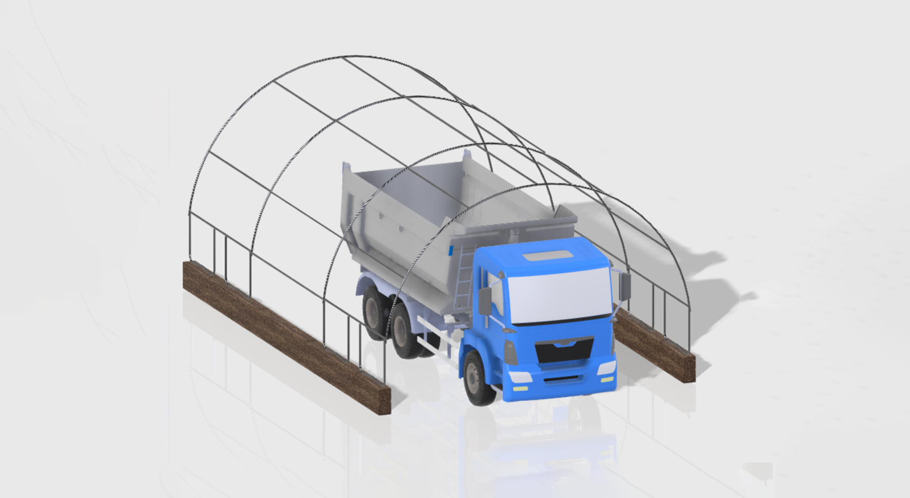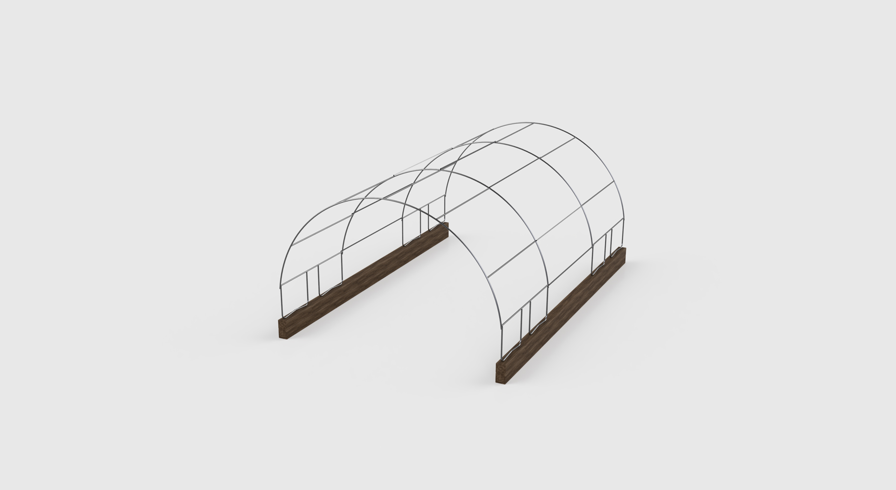 A friend asked me to help him with a fairly unique project - using repurposed materials to build a low-cost oversized garage for working on vehicles and machinery in the winter. The structure is derived from two 13' trampoline frames making up the four hoops, with 10' straight sections of steel tube connecting the middle. The eight trampoline legs are repurposed and attatch to reclaimed railroad timbers anchored into the ground with long rebar stakes.