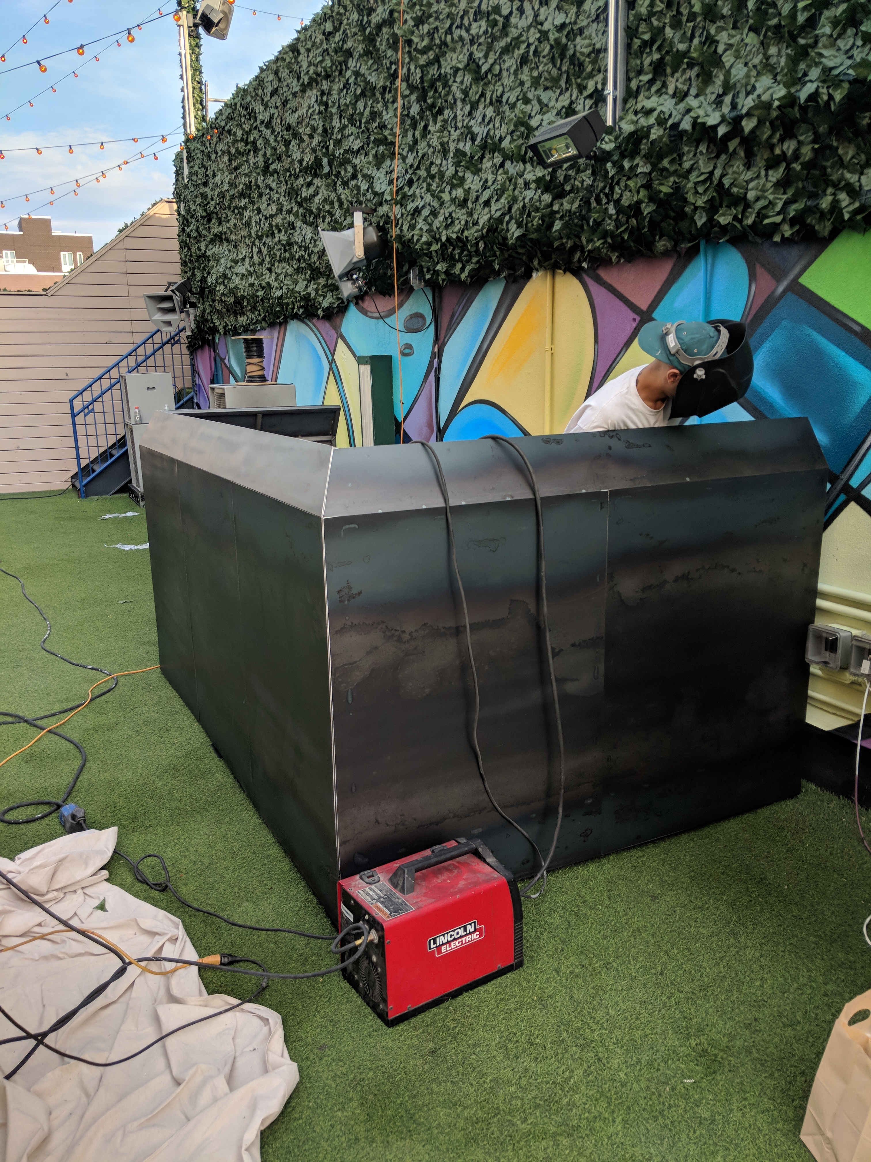 This DJ booth was crafted for The Roof terrace at Williamsburg's OUPUT nightclub. The venue was looking for a durable, functional, and unique platform for guest artists playing at their weekly rooftop events. Space on the roof is limited, so it was critical to implement a solution that would keep artists comfortable and audio equipment safe, while preserving The Roof's intimate environment.