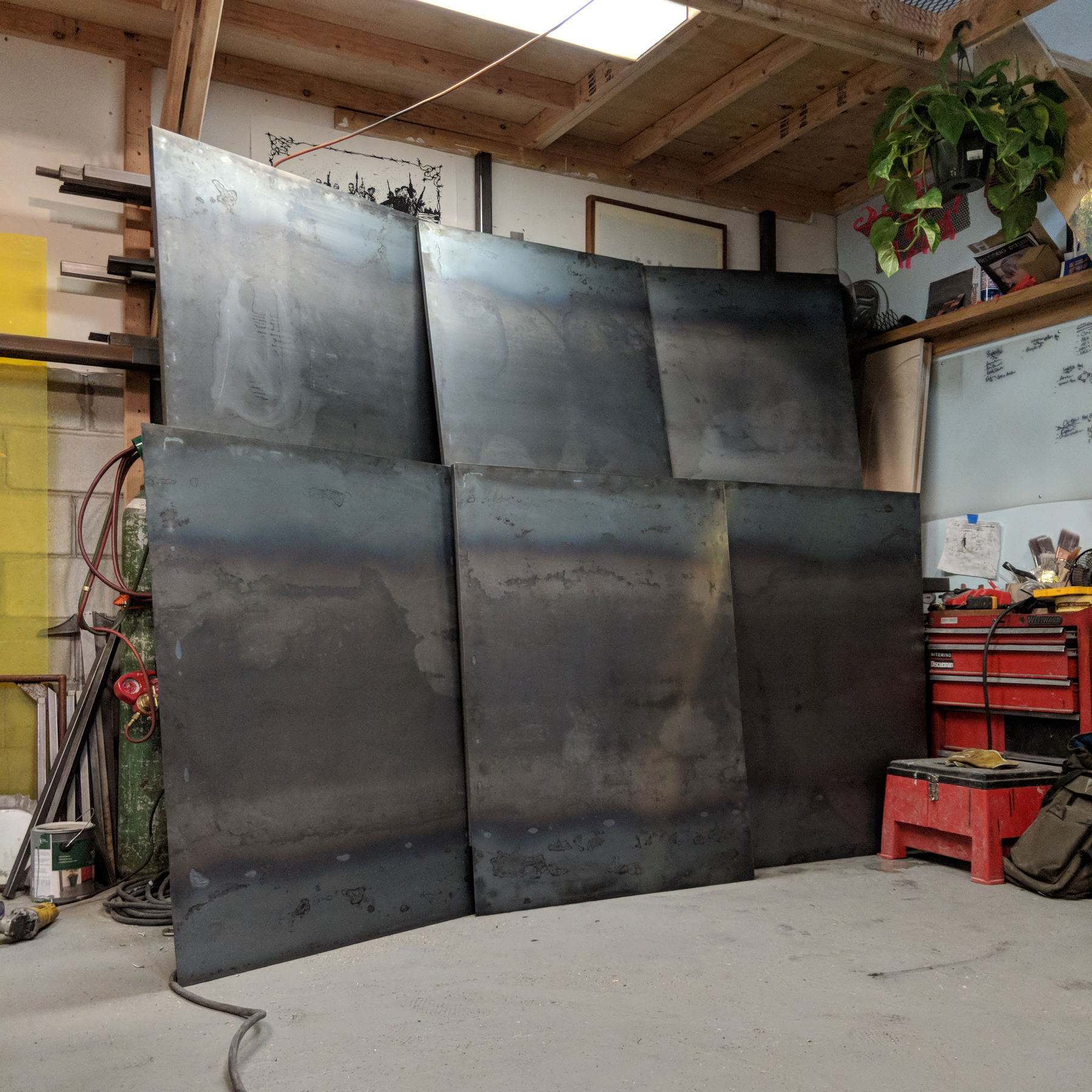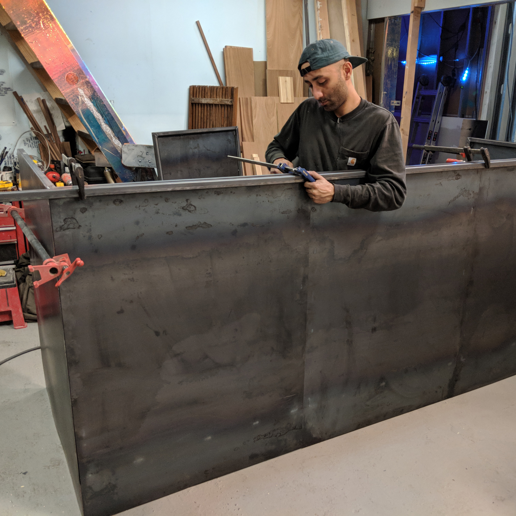 The booth is constructed of a series of nine steel panels which were bolted together onsite. This allows the venue to easily tear down and move the heavy structure for storage during the offseason. It was sprayed with a clearcoat finish.