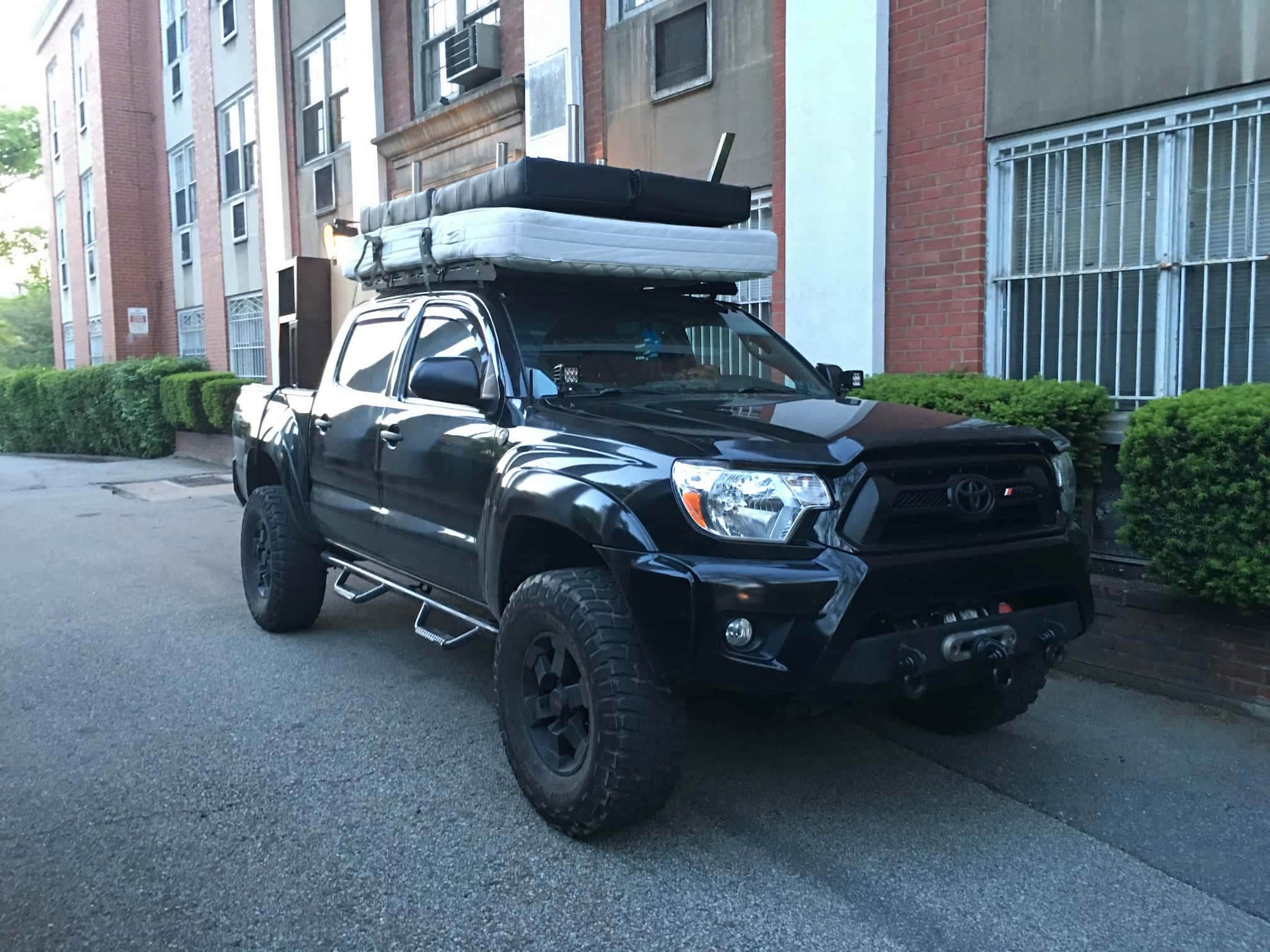 Unsatisfied with the aftermarket roof rack offerings for my Toyota Tacoma, I decided to design my own. Most of the racks out there were either too tall/clunky for my taste, or lacked the utility I was looking for. The final product is constructed of two aluminum side panels connected by aluminum extrusion cross bars.