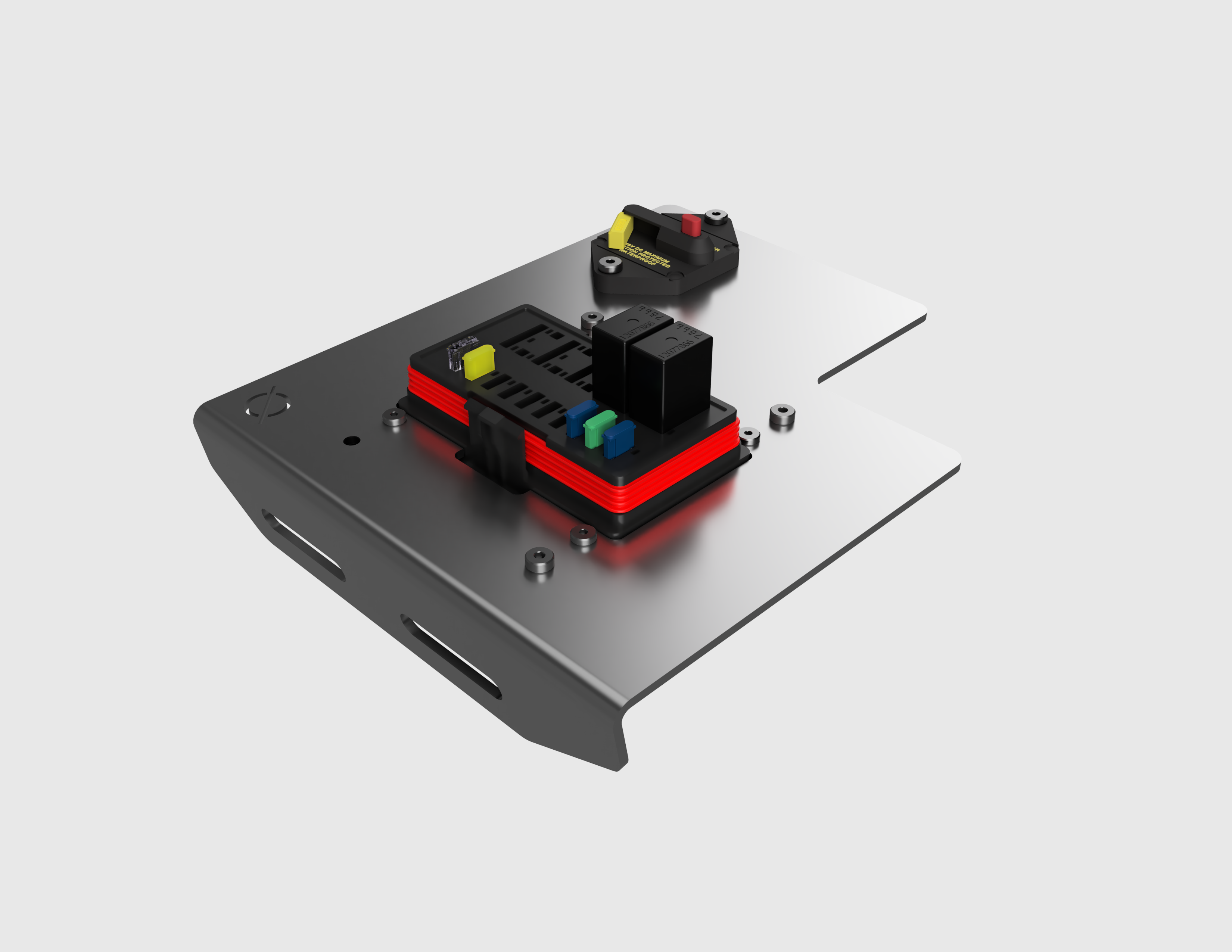 I designed this stainless steel panel to accomidate auxilary electrical wiring for my truck. It includes cutouts for a Bussmann RTMR 15303 fuse and relay box and a Blue Sea Systems 285-Series circuit breaker. The flange is bent at 95º to account for the slightly slanted under-hood mounting surface.