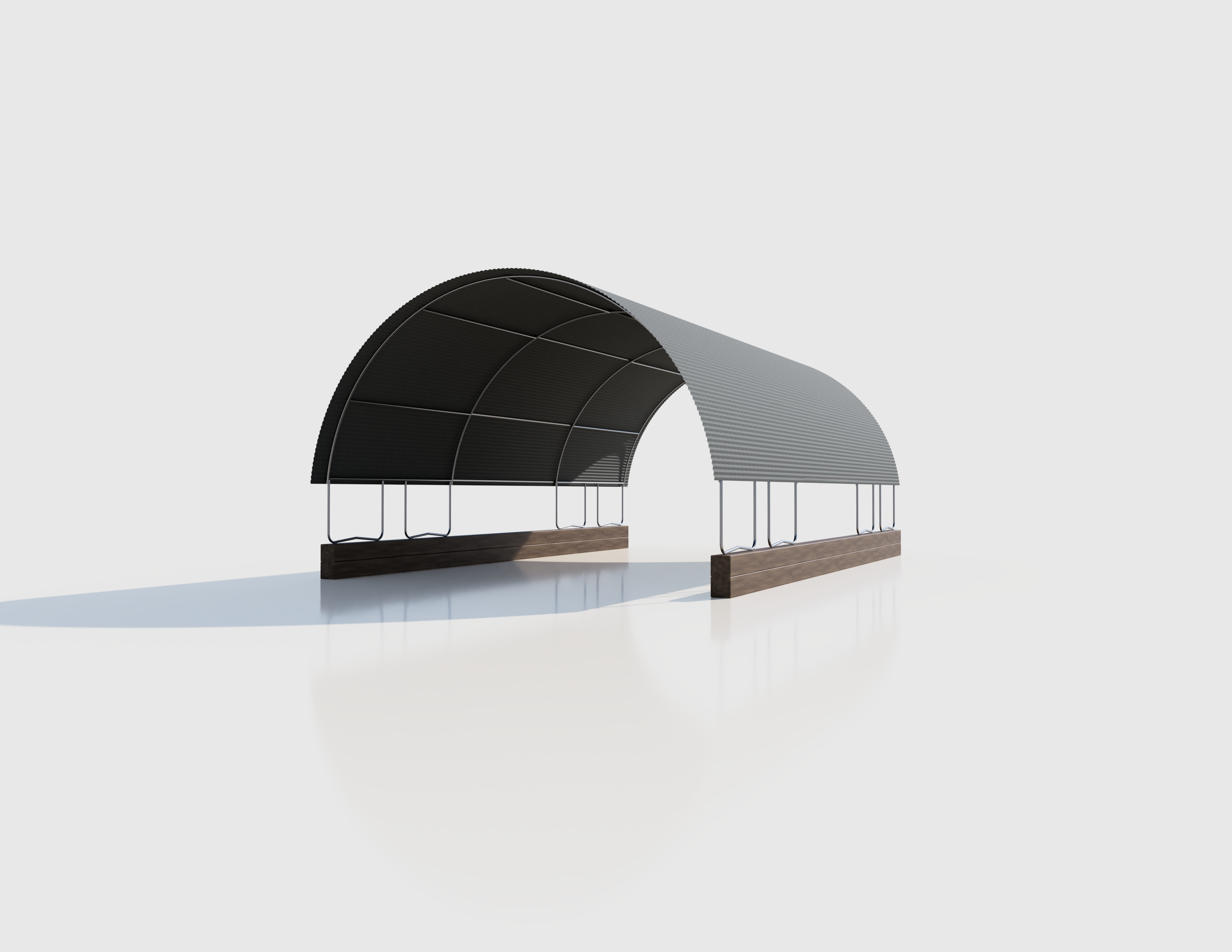 A friend asked me to help him with a fairly unique project - using repurposed materials to build a low-cost oversized garage for working on vehicles and machinery in the winter. The structure is derived from two 13' trampoline frames making up the four hoops, with 10' straight sections of steel tube connecting the middle. The eight trampoline legs are repurposed and attatch to reclaimed railroad timbers anchored into the ground with long rebar stakes.
