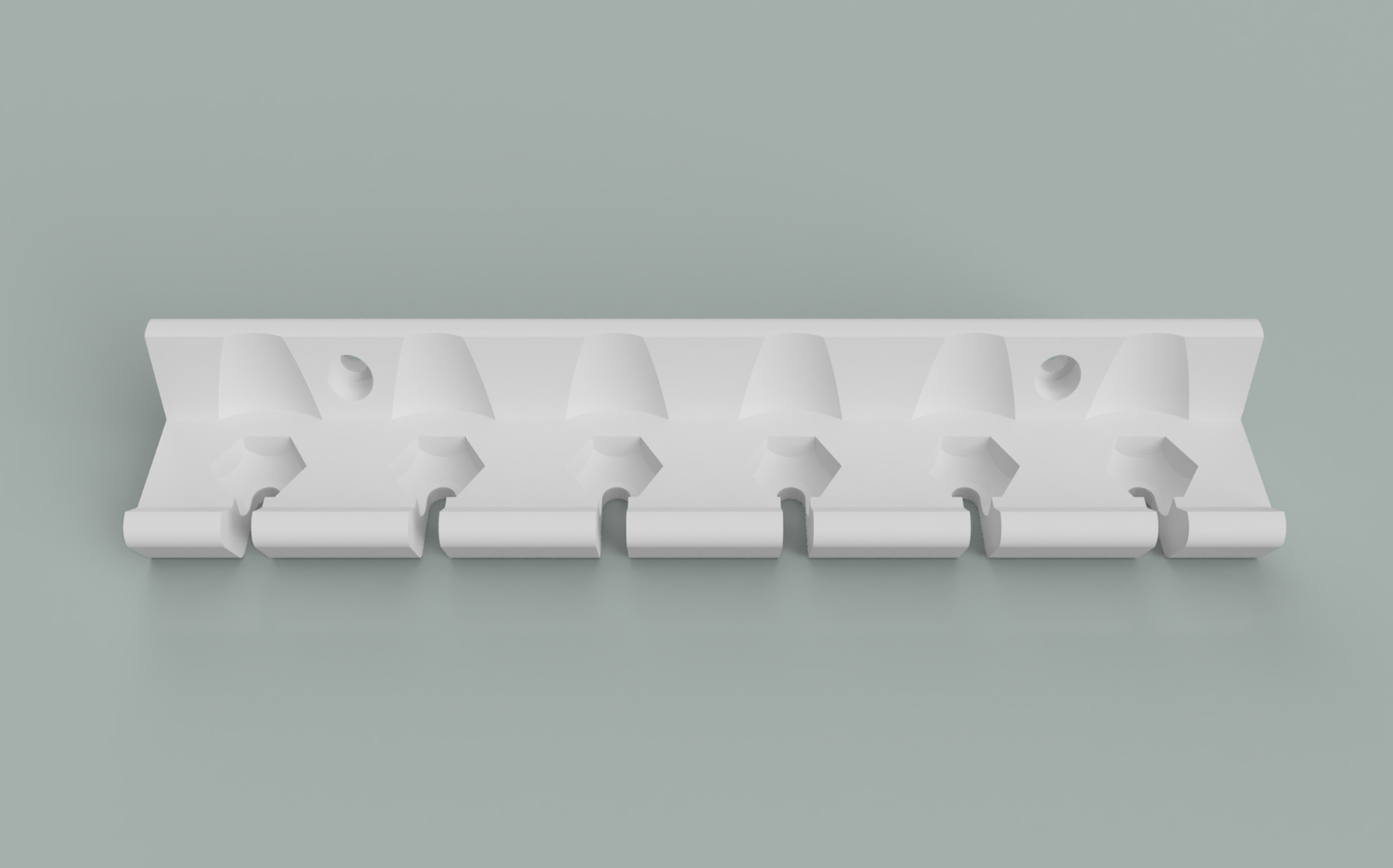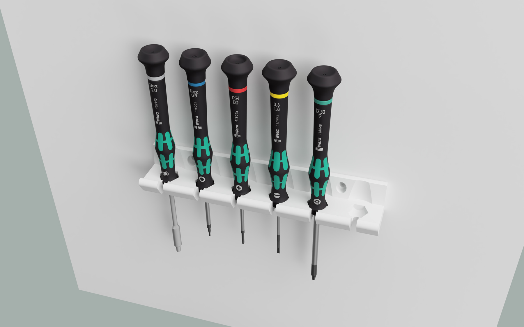 A rack that snuggly fits the unique domed hexagon shape of Wera's micro screwdrivers. Unlike the clunky rack included with Wera Microdriver sets, this vertically orients the screwdriver to make size and driver type markings readable. The rack pictured holds 6 screwdrivers, but capacity is limited only by the size of your 3D print bed. I've included download links for various sizes. Designed to mount with #6 or #8 round head screws.